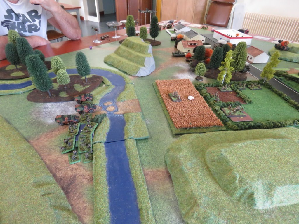 Tour 1 les russes avances vers le village, les français s'y installent pour garder les objectifs; les Rolands se placent en hauteur pour menacer de leurs missiles l'espace aérien. Les AMX-10RC, effectue une reconnaissance audacieuse , histoire de mettre la pression